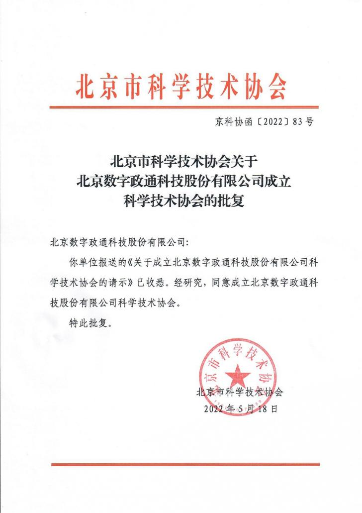 近日,北京市科學(xué)技術(shù)協(xié)會(huì)印發(fā)了《關(guān)于北京數(shù)字政通科技股份有限公司成立科學(xué)技術(shù)協(xié)會(huì)的批復(fù)》(京科協(xié)函【2022...